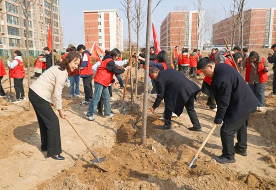草长莺飞,春光和煦,植树添绿正当时。为进一步贯彻落实党的二十大精神和习近平生态文明思想,在第46个植树节到来之际,bat365在线官方网站开展以“共同创造绿色、生机、健康的希望校园”为主题的植树节活动,校党委书记谭贞、校长王德如,校领导班子成员带领100余名师生开展义务植树活动。