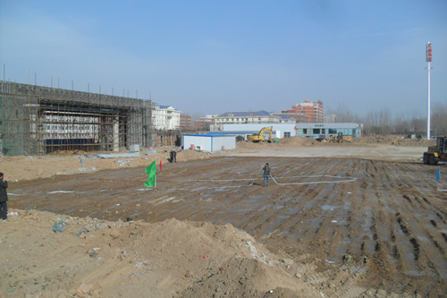 2、学校南大门附属用房拆模板,南广场垫层施工进行中﹙见下图﹚;
