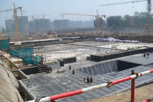 1、教师周转房11#楼地下防水卷材铺设进行中﹙见下图﹚;