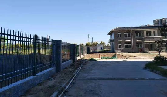成,西围墙砌筑和贴瓷砖完成75%,西围墙铁艺围栏完成50%,景观小道铺砖完成,服务用房周边铺砖完成;广场橡胶铺装前期施工工作完成。