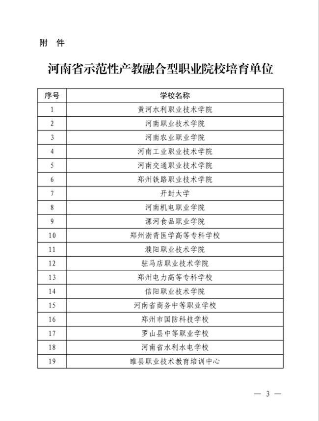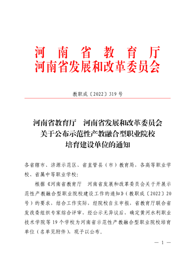 本站讯 近日,河南省教育厅、河南省发展和改革委员会发布了河南省首批示范性产教融合型职业院校培育单位评选结果,我校获批河南省首批示范性产教融合型职业院校培育建设单位。