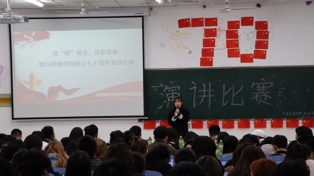 “经”“财”纷至,出彩青春。为引导大学生树立正确的世界观、人生观、价值观,进一步增强大学生的爱国情怀。2019年11月21日晚上,财政经济学院于15号楼203教室成功举办了“庆祝新中国成立七十周年”主题演讲比赛决赛。学院党总支书记赵志成、团总支负责人薛成、19级辅导员及团学联主要负责人出席并担任比赛评委。各年级同学共200余人参加此次活动。