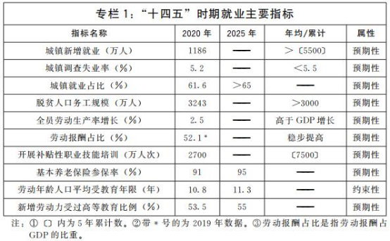 国发〔2021〕14号 各省、自治区、直辖市人民政府,国务院各部委、各直属机构: 现将《“十四五”就业促进规划》印发给你们,请认真贯彻执行。 国务院 2021年8月23日 (此件公开发布) “十四五”就业促进规划 就业是最大的民生,也是经济发展最基本的支撑。“十四五”时期,实现更加充分更高质量就业,是推动高质量发展、全面建设社会主义现代化国家的内在要求,是践行以人民为中心发展思想、扎实推进共同富裕的重要基础。本规划依据《中华人民共和国国民经济和社会发展第十四个五年规划和2035年远景目标纲要》编制,提出了“十四五”时期促进就业的指导思想、基本原则、主要目标、重点任务和保障措施,是推动就业高质量发展的工作指引。 一、发展环境 “十三五”期间,面对错综复杂的国际形势、艰巨繁重的国内改革发展稳定任务特别是新冠肺炎疫情的严重冲击,党中央、国务院始终坚持以人民为中心,将就业摆在经济社会发展优先位置,创新实施就业优先政策,推动就业工作取得积极进展。全国城镇新增就业6564万人,城镇调查失业率均值控制在5.2%,劳动年龄人口平均受教育年限从10.2年提高到10.8年,技能劳动者总量由1.3亿人增至2亿人,就业形势总体稳定,就业结构持续优化,就业质量不断提升。 “十四五”时期是我国全面建成小康社会、实现第一个百年奋斗目标之后,乘势而上开启全面建设社会主义现代化国家新征程、向第二个百年奋斗目标进军的第一个五年。当前和今后一段时期,我国发展仍然处于重要战略机遇期,党中央、国务院高度重视就业问题,实施就业优先战略,为实现更加充分更高质量就业提供了根本保证;我国已转向高质量发展阶段,以国内大循环为主体、国内国际双循环相互促进的新发展格局加快构建,经济稳中向好、长期向好,为就业长期稳定创造了良好条件;新一轮科技革命和产业变革深入发展,新兴就业创业机会日益增多;新型城镇化、乡村振兴孕育巨大发展潜力,新的就业增长点不断涌现;劳动力市场协同性增强,劳动力整体受教育程度上升,社会性流动更加顺畅,为促进就业夯实了人力资源支撑。 但也要看到,“十四五”时期就业领域也出现了许多新变化新趋势。人口结构与经济结构深度调整,劳动力供求两侧均出现较大变化,产业转型升级、技术进步对劳动者技能素质提出了更高要求,人才培养培训不适应市场需求的现象进一步加剧,“就业难”与“招工难”并存,结构性就业矛盾更加突出,将成为就业领域主要矛盾。城镇就业压力依然较大,促进高校毕业生等重点群体就业任务艰巨,在工业化、城镇化进程中,还有大量农村富余劳动力需要转移就业,规模性失业风险不容忽视。同时,就业歧视仍然存在,灵活就业人员和新就业形态劳动者权益保障亟待加强;人工智能等智能化技术加速应用,就业替代效应持续显现;国际环境日趋复杂,不稳定性不确定性明显增加,对就业的潜在冲击需警惕防范。总之,就业形势仍较严峻。必须深刻认识就业领域主要矛盾的变化,深入分析面临的挑战和风险,坚持问题导向,采取务实举措,抓住机遇,调动各种积极因素,不断开创就业工作新局面,努力实现更加充分更高质量就业。 二、总体要求 (一)指导思想。 以习近平新时代中国特色社会主义思想为指导,深入贯彻党的十九大和十九届二中、三中、四中、五中全会精神,统筹推进“五位一体”总体布局,协调推进“四个全面”战略布局,坚持稳中求进工作总基调,立足新发展阶段,完整、准确、全面贯彻新发展理念,构建新发展格局,统筹发展和安全,以实现更加充分更高质量就业为主要目标,深入实施就业优先战略,健全有利于更加充分更高质量就业的促进机制,完善政策体系、强化培训服务、注重权益保障,千方百计扩大就业容量,努力提升就业质量,着力缓解结构性就业矛盾,切实防范和有效化解规模性失业风险,不断增进民生福祉,推动全体人民共同富裕迈出坚实步伐。 (二)基本原则。 ——坚持就业导向、政策协同。继续把就业摆在经济社会发展和宏观政策优先位置,作为保障和改善民生头等大事,把稳定和扩大就业作为宏观调控的优先目标和经济运行合理区间的下限,根据就业形势变化,及时调整宏观政策取向、聚力支持就业。 ——坚持扩容提质、优化结构。兼顾容量、质量与结构,抓住主要矛盾,在多措并举创造更多高质量就业岗位的同时,更加重视日益凸显的结构性就业矛盾,聚焦劳动者技能素质提升,突出抓好技术技能人才培养培训,推动形成劳动力市场更高水平的供需动态平衡。 ——坚持市场主导、政府调控。推动有效市场和有为政府更好结合,既要坚持市场化社会化就业方向,加快破除制约就业的体制机制障碍,充分发挥市场配置劳动力资源的决定性作用,又要强化政府责任,优化整合各类资源,为促进就业提供强有力政策支持和基础性服务保障。 ——坚持聚焦重点、守住底线。紧盯就业领域关键环节和突出问题,瞄准重点地区、重点行业和重点群体,制定更加精准有效的举措,因地因企因人强化分类帮扶援助,切实兜牢民生底线。 (三)主要目标。 到2025年,要实现以下目标: ——就业形势总体平稳。城镇新增就业5500万人以上,努力实现更大规模,城镇调查失业率控制在5.5%以内,重点群体就业保持稳定。城乡、区域就业机会差距逐步缩小,劳动力