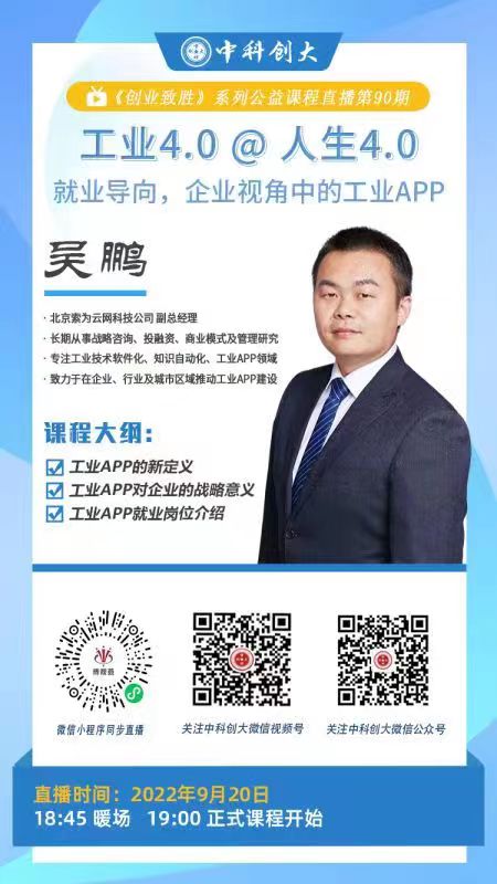 各位老师同学们好,本周《创业致胜》公益课程,仍将于本周二晚上7点如期进行。本期平台邀请到索为集团副总经理吴鹏先生,为大家解读“工业APP”,相信大家会有所收获。扫描海报下方二维码即可观看,课程诚挚欢迎老师们学生们。