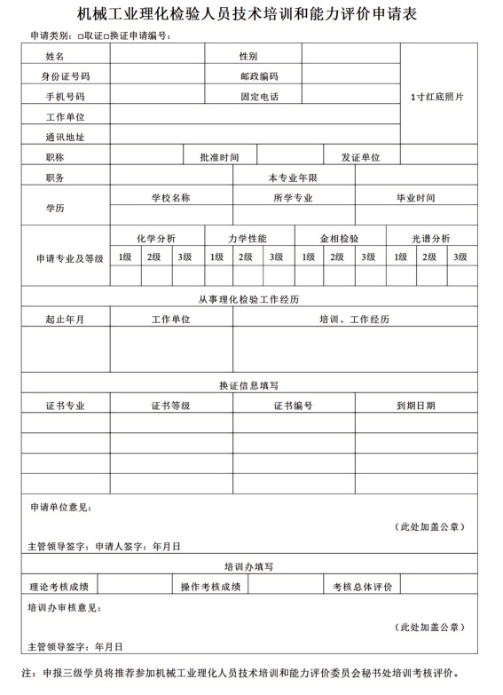 《机械工业理化检验人员技术培训及能力评价申请表》(见附件2)纸质版和扫描件或清晰照片,要求使用电脑填写打印,并加盖单位公章;