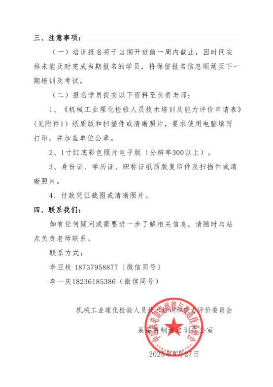 关于开展理化检验人员技术培训和能力评价工作培训安排的通知