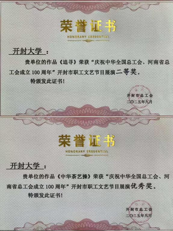 近日,在庆祝中华全国总工会、河南省总工会成立100周年开封市职工文艺节目展演活动中,我校选送的节目凭借精妙的编排与精湛的表演,从众多参赛作品中脱颖而出,获得优异成绩。