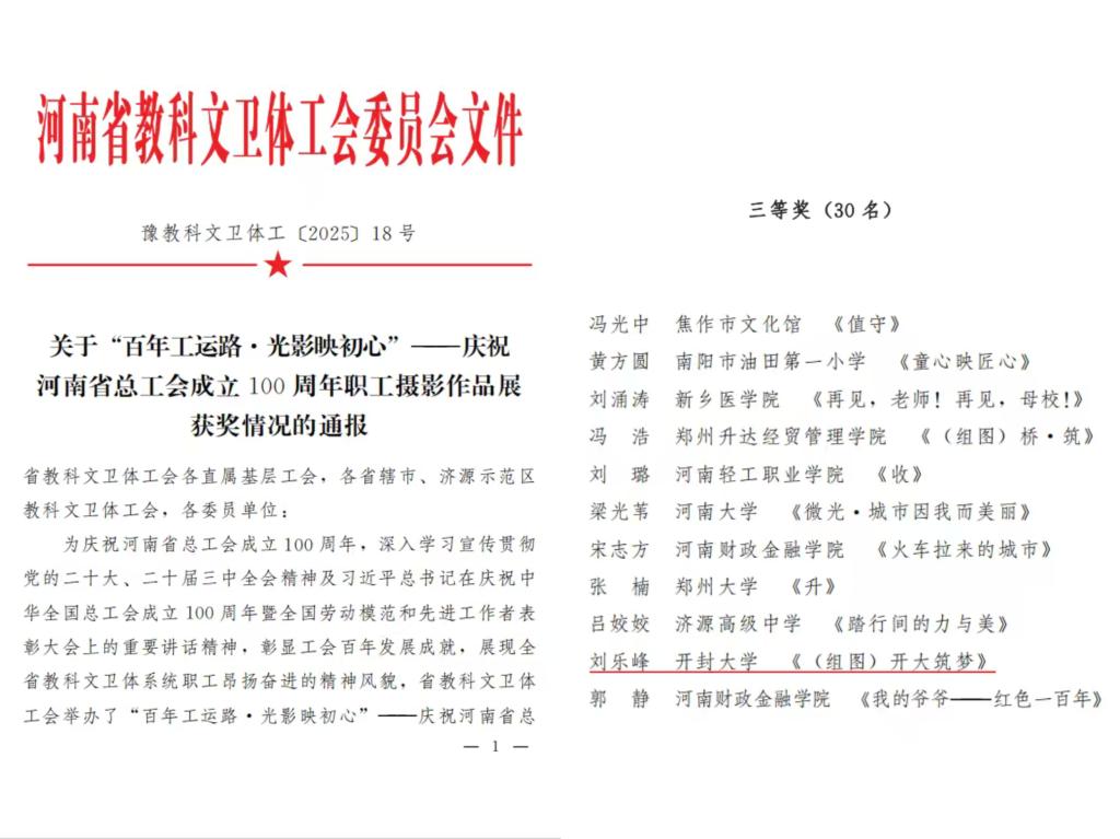 在河南省教科文卫体工会举办的摄影比赛中,教务处刘乐峰老师获得三等奖。