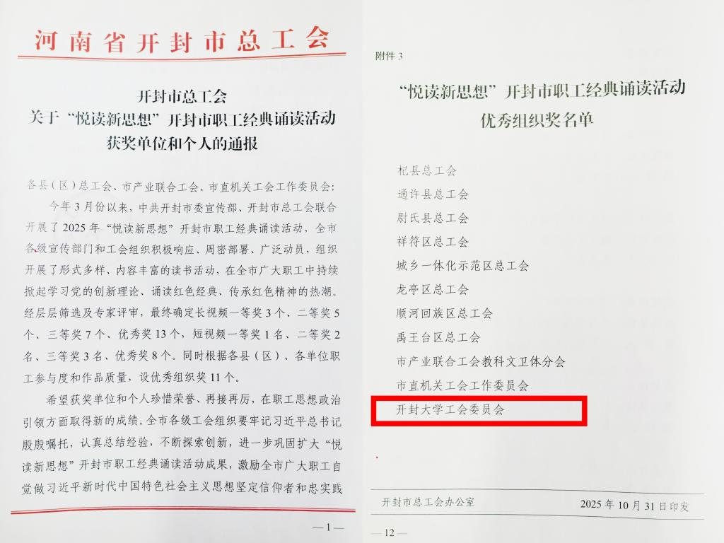 在开封市职工经典诵读活动中,学校积极响应、精心组织,以精彩的节目与突出的活动成效荣获“优秀组织奖”。