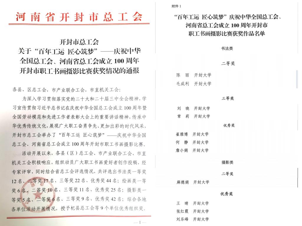 近日,由河南省教科文卫体工会、开封市总工会举办的多项比赛获奖名单公布。我校教职工凭借扎实的艺术功底与独特的审美视角脱颖而出,斩获多项荣誉,充分展现了新时代教育工作者的文化素养与精神风貌。