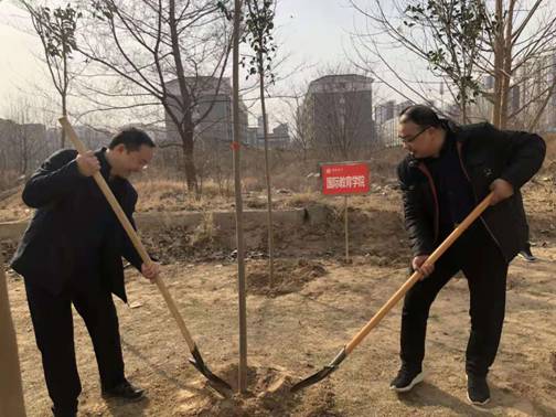 春回大地,万象更新,为美化校园环境,3月7日下午,国际教育学院党总支书记陈力、副书记赵骅带领我院部分师生积极参加学校组织的以“建绿色校园 尚劳动精神”为主题的植树节活动。