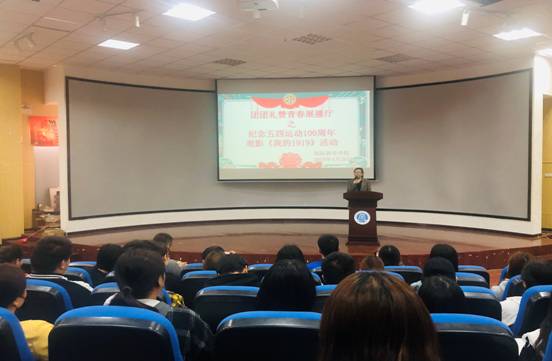 为加强学生爱国主义教育,4月29日,国际教育学院在5号楼一楼报告厅举办 “团团礼赞青春展播厅之纪念五四一百周年”观影活动,集体观看电影《我的1919》。团总支书记刘青、辅导员贺钰老师以及18级全体学生参加了本次活动。