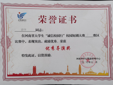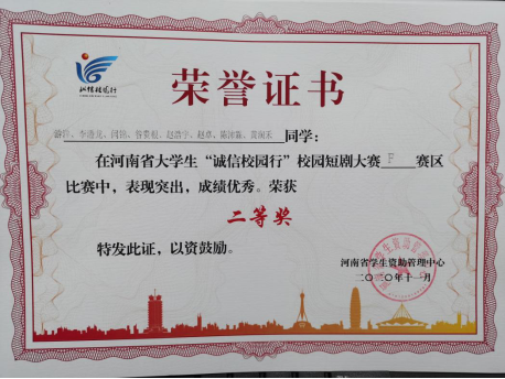 国际教育学院学生在2020年11月举办的河南省大学生“诚信校园行”校园短剧大赛中喜获佳绩。由游洋、李潘龙、闫锦、昝贵根、赵浩宇、赵卓、陈沛霖、黄润禾同学主演的短剧《“贷”来的陷阱》获二等奖;游洋同学获优秀导演奖。