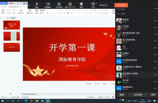 9月13日下午,为做好疫情形势下新生的入学教育工作,加强大学生学业教育、安全教育和疫情防控常态化下的日常教育管理,推动新学期学生工作的有序开展,我院2022级新生辅导员开展线上“开学第一课”主题班会。