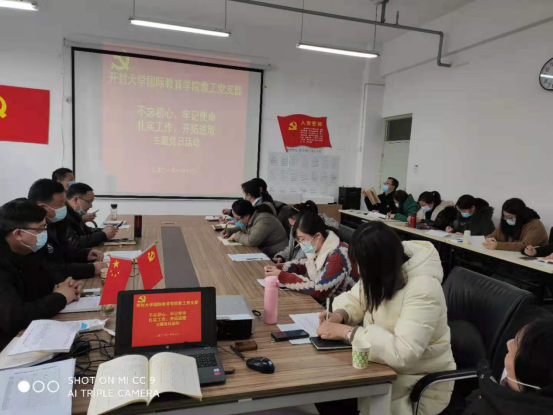 国际教育学院教工党支部于1月13日下午开展“不忘初心、牢记使命,扎实工作、开拓进取”5+N党日活动。全体党员重温入党誓词。(常琳同志领誓)。本月过政治生日的党员薄利娜同志发言;袁长征同志送出寄语。由陈力同志带领学习领会2021年全国教育工作会议精神。由蒋大山同志带领继续学习《习近平谈治国理政第三卷》第1篇。随后交纳了党费,通报了12月份党员积分情况。