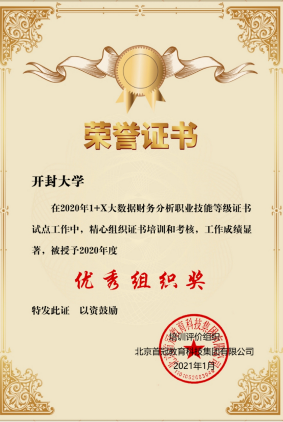 我校在2020年度“1+X”大数据财务分析职业技能等级证书考试试点工作中表现突出,被评为“优秀组织单位”。