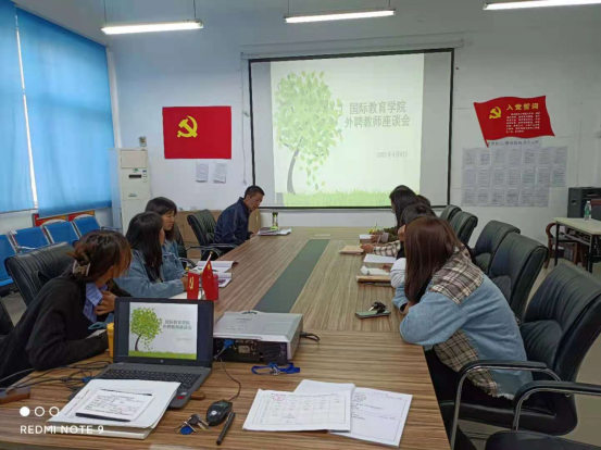 4月8日下午,国际教育学院在院会议室召开外聘教师座谈会,参加会议的有教学副院长蒋大山、教研室主任黄艺琴、李傲然、教科办主任王赛及本学期的6名外聘教师。