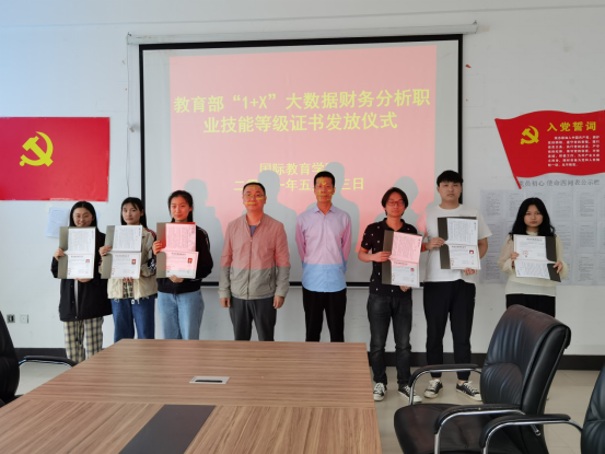5月13日,国际教育学院在会议室举行了“1+X”证书发放仪式。院长、副院长为上学期考取大数据财务分析职业等级证书的学生代表颁发了证书,鼓励同学们继续努力学习专业知识和技能,为将来就业打下良好基础。