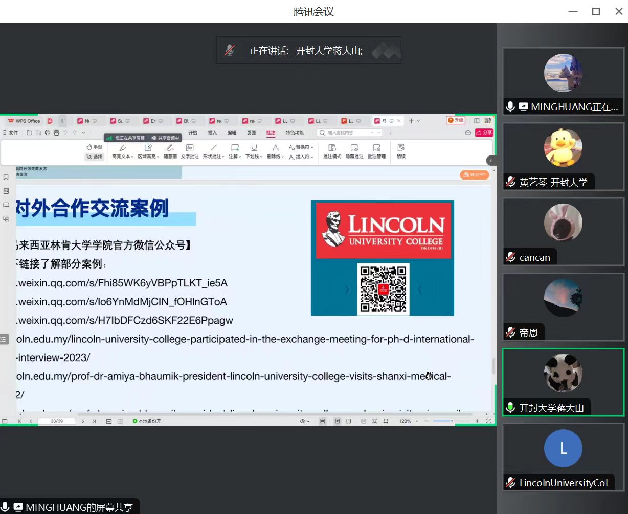 为全面推进学校国际化办学,拓宽我校师生交流和学历提升路径,3月12日,我校召开了马来西亚林肯大学线上宣讲会,相关院部教师代表参加,国际教育学院副院长蒋大山主持会议。