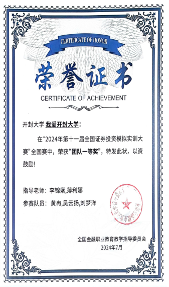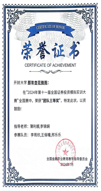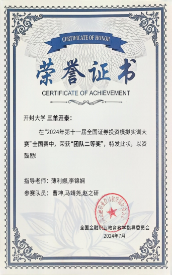 本次比赛历时一个半月,全程线上进行。22会计吴云扬、黄冉、刘梦洋获得一等奖;22会计马靖尧、曹坤、赵之研、李亚洲、秦梓鹏、许诣博,23会计肖承扬、兰博、寇青昊获得二等奖;22会计任冠晓、马富豪、刘敬存、李雨欣、王俪曈、邢乐乐,23物流谭文麒、代鑫臣、董家豪、王小茹、张煜若、楚聪聪获得三等奖。本次大赛是以证券业为背景,基于证券从业者所应具备的行业知识、基本业务技能及实操技能等设计的综合实训大赛。比赛进行过程中,李锦娴、薄利娜老师带队指导,辅助学生在比赛中稳扎稳打。