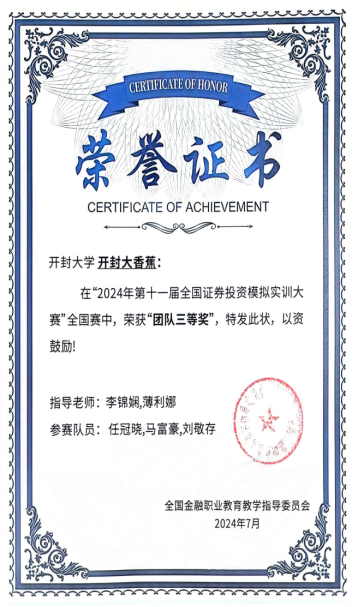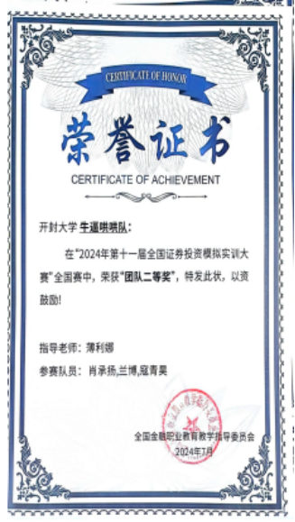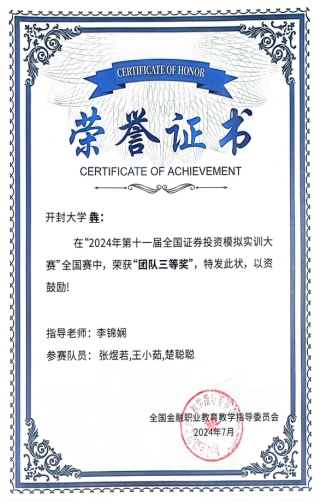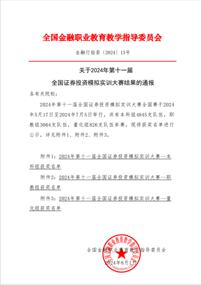 由全国金融职业教育教学指导委员会主办的“2024年全国证券投资模拟实训大赛”于2024年7月圆满落幕。我院共有20支代表队参加比赛,与近200所高职院校、2000多支队伍进行激烈角逐,最终,1支队伍获得团体一等奖,3支队伍获得团体二等奖,4支队伍获得团体三等奖。
