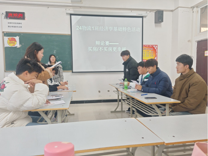 2024年11月29日下午,国际教育学院(外国语学院)2024级现代物流管理专业1班在15号教学楼213教室举行了特色课堂辩论赛活动,同学们以“买房/不买房更幸福”为辩题展开激烈交锋,正方观点:买房更幸福,反方观点:不买房更幸福,正方辩手4人,反方辩手4人,各方计时员2人,主持人1人,任课老师康峰卓和剩余34名同学担任评委。