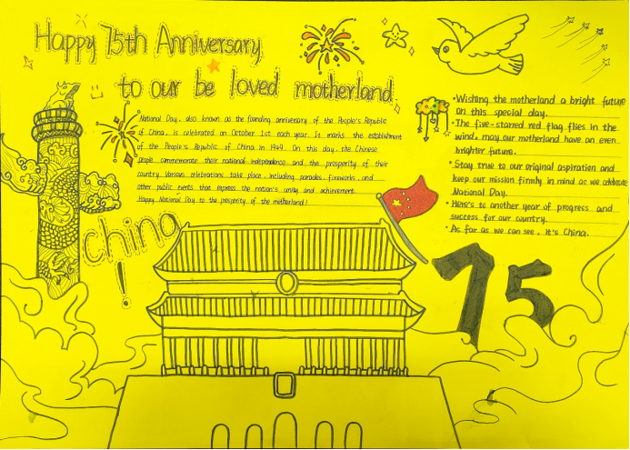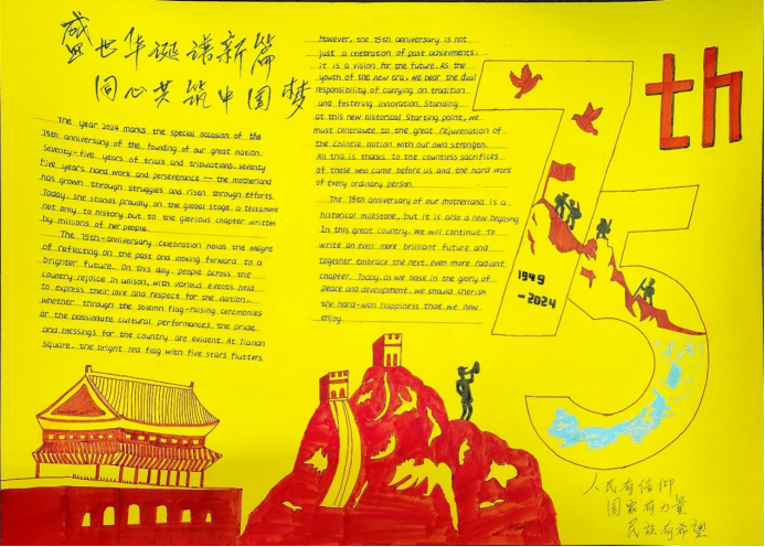 本届英语手抄报大赛以“庆祝新中国成立75周年华诞”为主题,由学院2024级全体学生参与,以小组为单位,通过手抄报,展示中华儿女的拳拳爱国之情,将学子的真挚祝福献于新中国成立75周年华诞。比赛分为初赛和复赛两个阶段,综合班级投票,学院全体老师投票以及评审团评审,最终评选出一等奖2组,二等奖4组,三等奖6组和最佳人气奖3组。