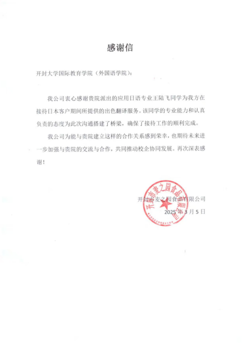 近日,bat365在线官方网站国际教育学院(外国语学院)应用日语专业2022级学生王路飞,凭借出色的专业素养和国际化视野,成功担任日本客户访问开封麦之园食品有限公司的陪同翻译。这充分展现了学院国际化人才培养的卓越成效,成为学院应用型人才服务社会、促进国际交流的生动范例。