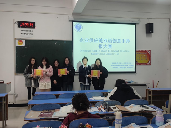 为进一步增强学生对著名企业供应链架构的了解,提高学生的双语表达能力和创新思维,培养学生的团队合作精神,丰富校园文化生活。2024年10月16日,国际教育学院(外国语学院)任课教师李俊霞组织23物流班于15号教学楼207教室成功举办了企业供应链架构双语手抄报大赛。经过评委们认真细致地审阅、讨论以及打分,最终从众多优秀的参赛作品中评选出了各个奖项,一等奖(1组)二等奖(三组)三等奖(6组)。
