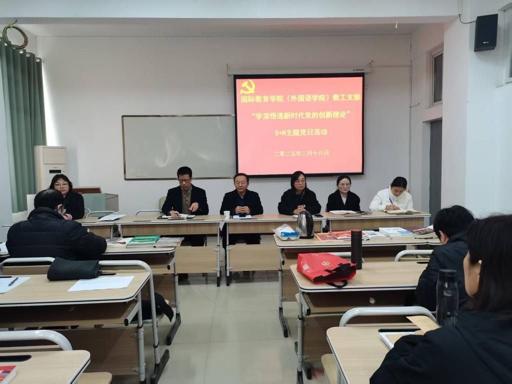 2月28日下午三点,国际教育学院(外国语学院)在5号楼一楼会议室开展了“学深悟透新时代党的创新理论”主题党日活动,校党委委员、副校长李治和学院全体教工党员参加了本次活动。