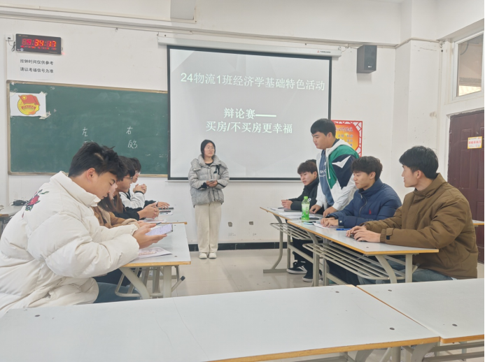 2024年11月29日下午,国际教育学院(外国语学院)2024级现代物流管理专业1班在15号教学楼213教室举行了特色课堂辩论赛活动,同学们以“买房/不买房更幸福”为辩题展开激烈交锋,正方观点:买房更幸福,反方观点:...