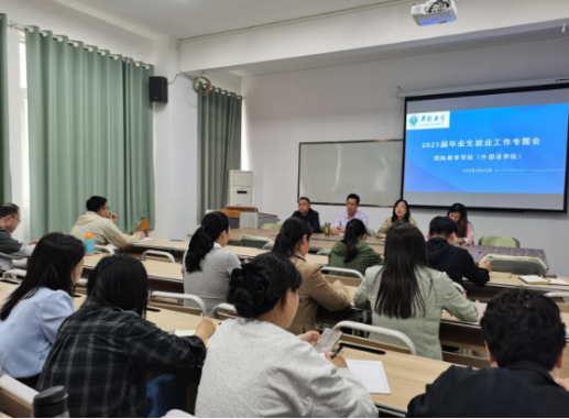 To thoroughly implement the Ministry of Education's employment policies for college graduates, the International Education(Foreign Languages)Collegeconvened a special employment conference on the afternoon of May 9 in Room 5#107. Attending the meeting were Party Branch Secretary Cheng Xin and Dean Jiang Dashan, along with 30 participants including department heads, graduating class counselors, and internship instructors.