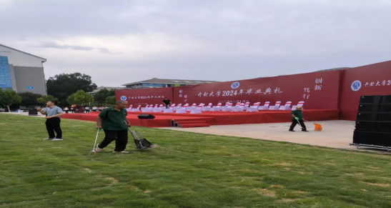 6月14日学校举行毕业典礼活动,为保障活动现场卫生质量,给师生创造干净、整洁的会场环境,6月13日下午后勤卫健办组织工作人员冒着烈日酷暑,对硬化路面以及草坪内的砖头瓦坏、白色垃圾、杂草、积土进行大清理工作。