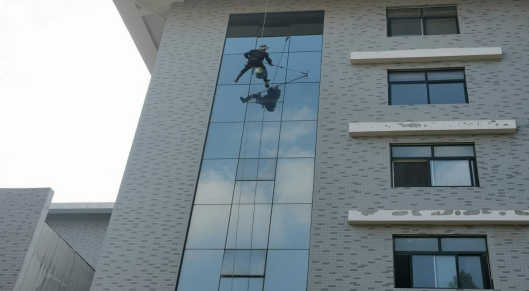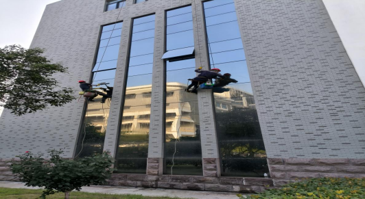 3、为提升楼宇服务形象,对行政楼玻璃幕墙进行清洗,面貌焕然一新;