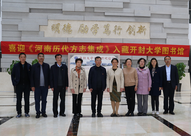 本站讯 4月14日,河南省地方史志办公室向我校捐赠了《河南历代方志集成》《河南省志》《传承》《河南历代诗人咏河南》等系列文献。我校党委书记陈灿、党委委员工会主席成芳、党委委员副校长谢文忠代表学校接受捐赠,陈书记向河南省地方史志办公室党组书记、主任管仁富颁发了赠书感谢状。