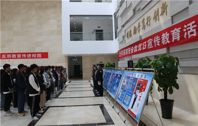 保卫处联合开封市公安局反邪教支队、北郊乡派出所政保大队在校图书馆二楼大厅开展了反邪教、反恐怖、防渗透为主题的教育活动,向学生介绍国家安全知识并引导学生参观了反恐怖警示展板。同时联合后勤管理服务中心,在所有宿舍楼内张贴了3000余张防诈骗宣传单。