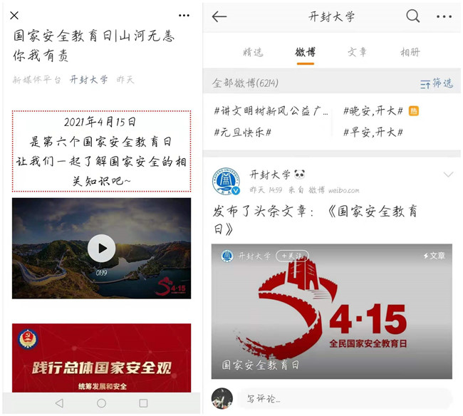 为了营造浓厚的国家安全的宣传氛围,方便师生学习掌握国家安全知识,党委宣传部在学校官方微博、微信公众号上推送《践行总体国家安全观》的文章和国家安全知识线上测试,利用电子显示屏、宣传栏等展示关于国家安全日教育活动的各类宣传标语,教育引导广大师生切实提高维护国家安全的自觉性和主动性。