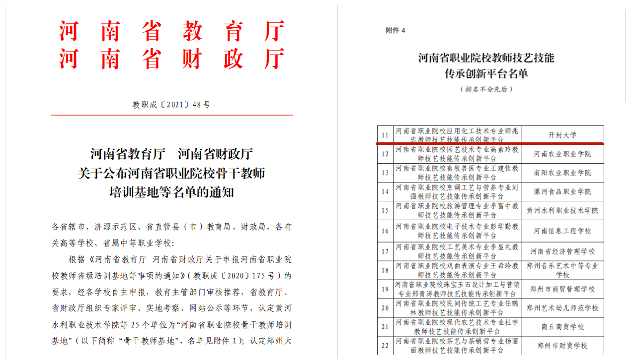 本站讯 近日,河南省教育厅、财政厅组织开展了河南省职业院校教师技艺技能传承创新平台建设计划评审活动。我校材料与化学工程学院院长师兆忠教授主持申报的“应用化工技术专业师兆忠教师技艺技能传承创新平台”脱颖而出,获批职业教育技艺技能传承创新平台。