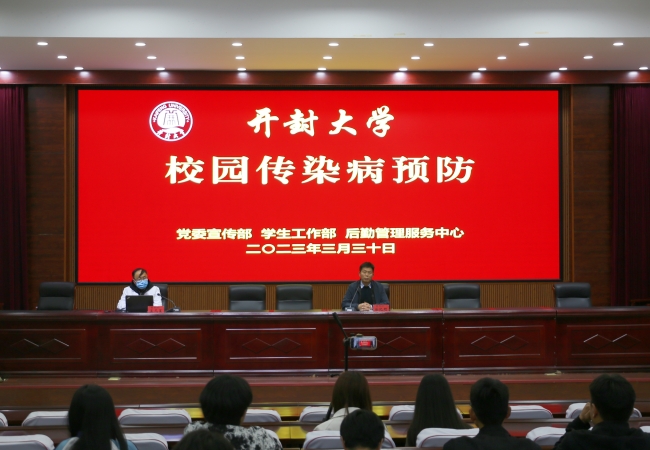 本站讯  为进一步加强学校春季传染病防治工作,普及校园常见传染病预防知识,提高学生的防控意识和自我防护能力,充分发挥后勤育人功能,3月30日下午,我校邀请祥符区杜良卫生院副主任医师孟凡星主任在行政楼一楼会议厅为师生开展“后勤课堂—校园春季传染病”专题讲座。讲座由后勤管理服务中心主任徐纪珂主持。