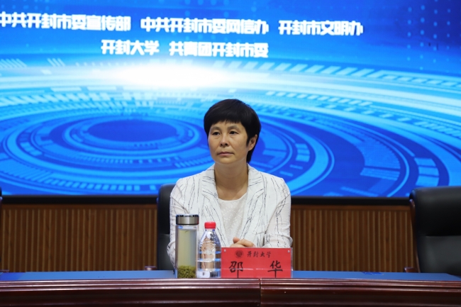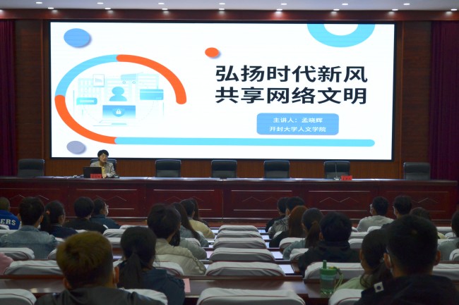 在行政楼第一会议厅,我校网络素养教育实践基地教师孟晓辉向开封市各高校师生代表开展了题为《弘扬时代新风  共享网络文明》的网络素养教育专题讲座。市委网信办工作人员在讲座现场与学生进行了网络文明小知识互动答题。