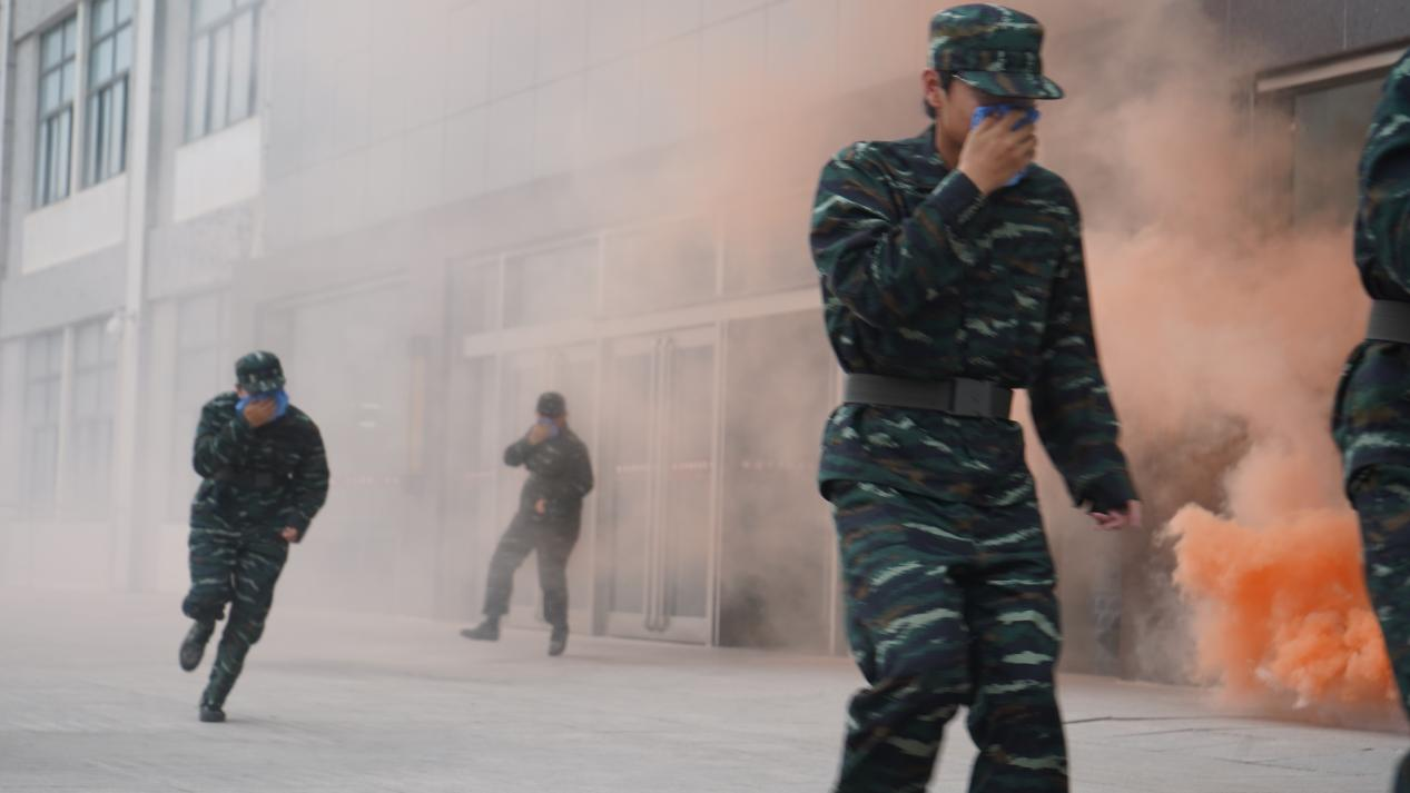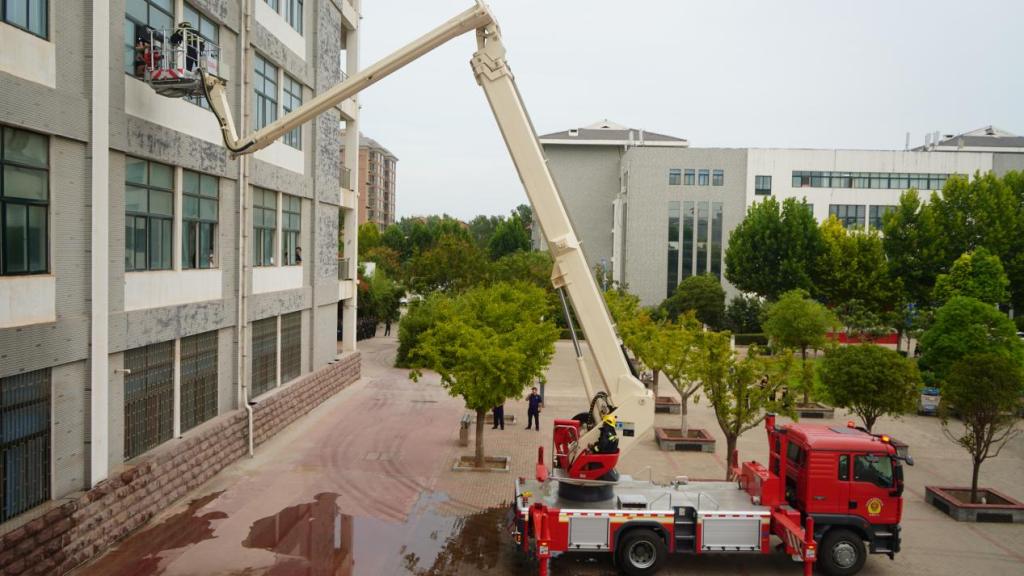 实践观摩环节以图书馆为“模拟火场”,进行应急疏散逃生演练,100余名学生代表用湿毛巾紧捂口鼻、弯腰俯身、穿越浓烟区域,在工作人员引导下安全有序撤离至室外预定地点,2名被困在三楼的人员乘坐高空救援车被顺利救助脱险。整个疏散过程井然有序、行动迅速。紧张、快速、高效、专业的“灭火救援”引来现场观摩师生的阵阵赞叹。