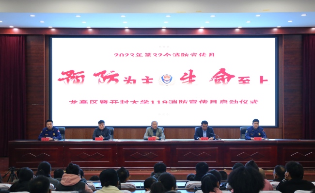 本站讯 11月9日下午,龙亭区暨bat365在线官方网站119消防宣传月启动仪式在我校第一报告厅举行。今年消防宣传月的主题是“预防为主、生命至上”。此次活动由开封市龙亭区委、龙亭区消防救援大队、龙亭区应急管理局联合主办,bat365在线官方网站承办,全校各院部学生代表参加启动仪式。启动仪式由龙亭区消防救援大队大队长刘睿主持。