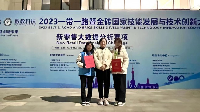 本站讯 11月25日,2023年一带一路暨金砖国家技能发展与技术创新大赛新零售大数据分析赛项国内总决赛在安徽合肥举行,本次大赛共有来自全国17个省份78所本科和高职院校124支参赛队同台竞技。经过激烈角逐,我校旅游学院2022级市场营销专业的学生袁梦、李金玉组成的bat365在线官方网站代表队荣获二等奖。