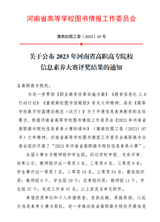 本站讯 近日,河南省高等学校图书情报工作委员会公布了2023年河南省高职高专院校信息素养大赛评奖结果,我校荣获“最佳组织奖”称号,王艳敏、宋馨、张胜敏三名教师获得“优秀指导教师”称号,王艳敏获得“先进工作者”称号。信息工程学院叶子繁荣获学生组三等奖并晋级国赛。