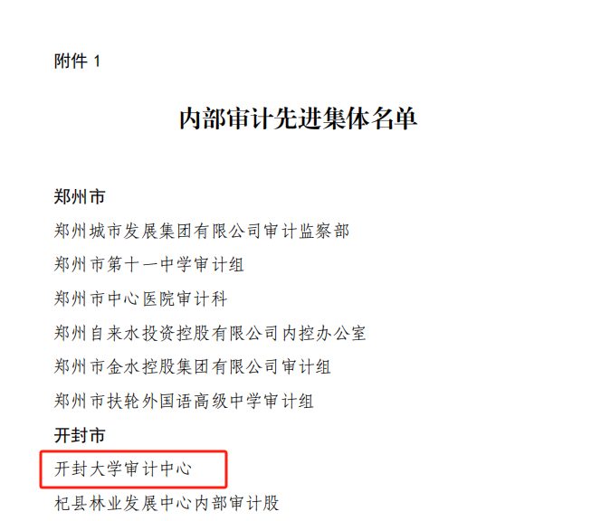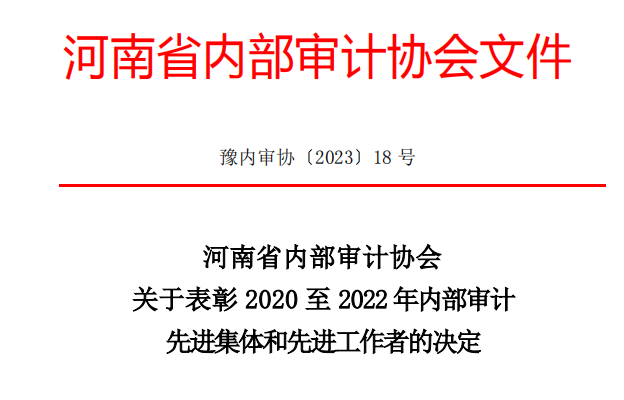 本站讯 近日,河南省内部审计协会印发了《关于表彰2020至2022年内部审计先进集体和先进工作者的决定》,我校审计中心荣获“全省内部审计工作先进集体”称号。