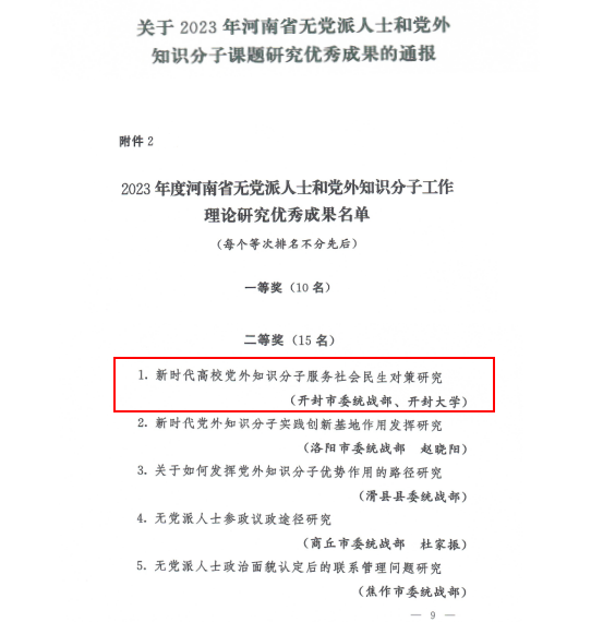 本站讯 近日,中共河南省委统战部办公室印发《关于2023年河南省无党派人士和党外知识分子课题研究优秀成果的通报》,对一批优秀调研成果进行表彰,我校提交的《新时代高校党外知识分子服务社会民生对策研究》荣获2023年度河南省无党派人士和党外知识分子工作理论研究优秀成果二等奖。