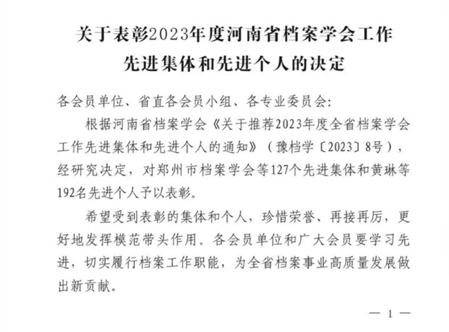 本站讯 2月2日,从河南省档案学会《关于表彰2023年度河南省档案学会工作先进集体和先进个人的决定》获悉,我校档案馆荣获“2023年度河南省档案学会工作先进集体”称号。