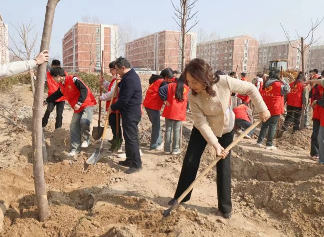 本站讯 草长莺飞,春光和煦,植树添绿正当时。为进一步贯彻落实党的二十大精神和习近平生态文明思想,在第46个植树节到来之际,我校开展以“共同创造绿色、生机、健康的希望校园”为主题的植树节活动,校党委书记谭贞、校长王德如,校领导班子成员带领100余名师生开展义务植树活动。