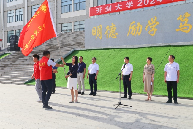 谭贞为防汛抢险突击总队和3个分队授旗。
