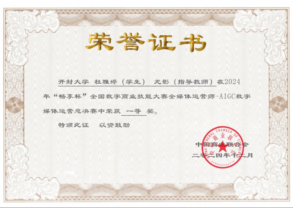 本站讯 12月28日,我校在2024年“畅享杯”全国数字商业技能大赛全媒体运营师-AIGC数字全媒体运营赛项中,分别荣获一等奖、二等奖各1项,在电子商务师-AIGC电子商务运营赛项中,分别荣获二等奖、三等奖各2项。